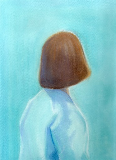 woman standing in front of a large blue painting