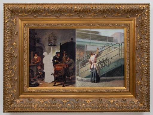 ヤン・ステーンの『鸚鵡に餌をやる女、バックギャモンに興じる二人の男およびその他の人物のいる室内、通称「鸚鵡の鳥籠」』に描かれた女性が、水晶橋近くで餌づけの練習をする